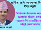 नेपालगञ्ज- लुम्बिनी प्रदेश सरकार सहरी विकास तथा भवन कार्यालय, नेपालगञ्जले चरम लापरबाहीपूर्ण ढंगले भोलिको मितिको कार्यक्रमसम्बन्धी सूचना आजै (मिति २०८२/०६/२१) गते नै प्रकाशित गरेको छ। कार्यालयले “जनता आवास निर्माणका लागि लाभग्राही छनोट सम्बन्धी निर्देशन” शीर्षकमा सूचना निकाल्दै मिति २०८२/०६/२८ गते सम्मका लागि आवास लाभग्राही छनोट कार्यक्रमका लागि निवेदन आव्हान गरेको छ । सहरी विकास तथा […]पूरा पढ्नुहोस् »