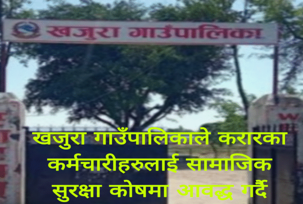 बाँकेको खजुरा गाउँपालिकाले करार सेवामा कार्यरत सम्पूर्ण कर्मचारीलाई योगदानमा आधारित सामाजिक सुरक्षा कोषमा आबद्ध गराउने निर्णय गरेको छ। नेपाल सरकारको श्रम, रोजगार तथा सामाजिक सुरक्षा मन्त्रालयको मिति २०८२/१/१ को राजपत्रमा प्रकाशित सुचना र मन्त्रालयको निर्णय अनुसार, करार सेवामा कार्यरत कर्मचारीहरूलाई सामाजिक सुरक्षा योजनामा सामेल गराउनका लागि खजुरा गाउँपालिकाले आवश्यक प्रक्रिया अघि बढाएको हो। खजुरा गाउँपालिका […]
