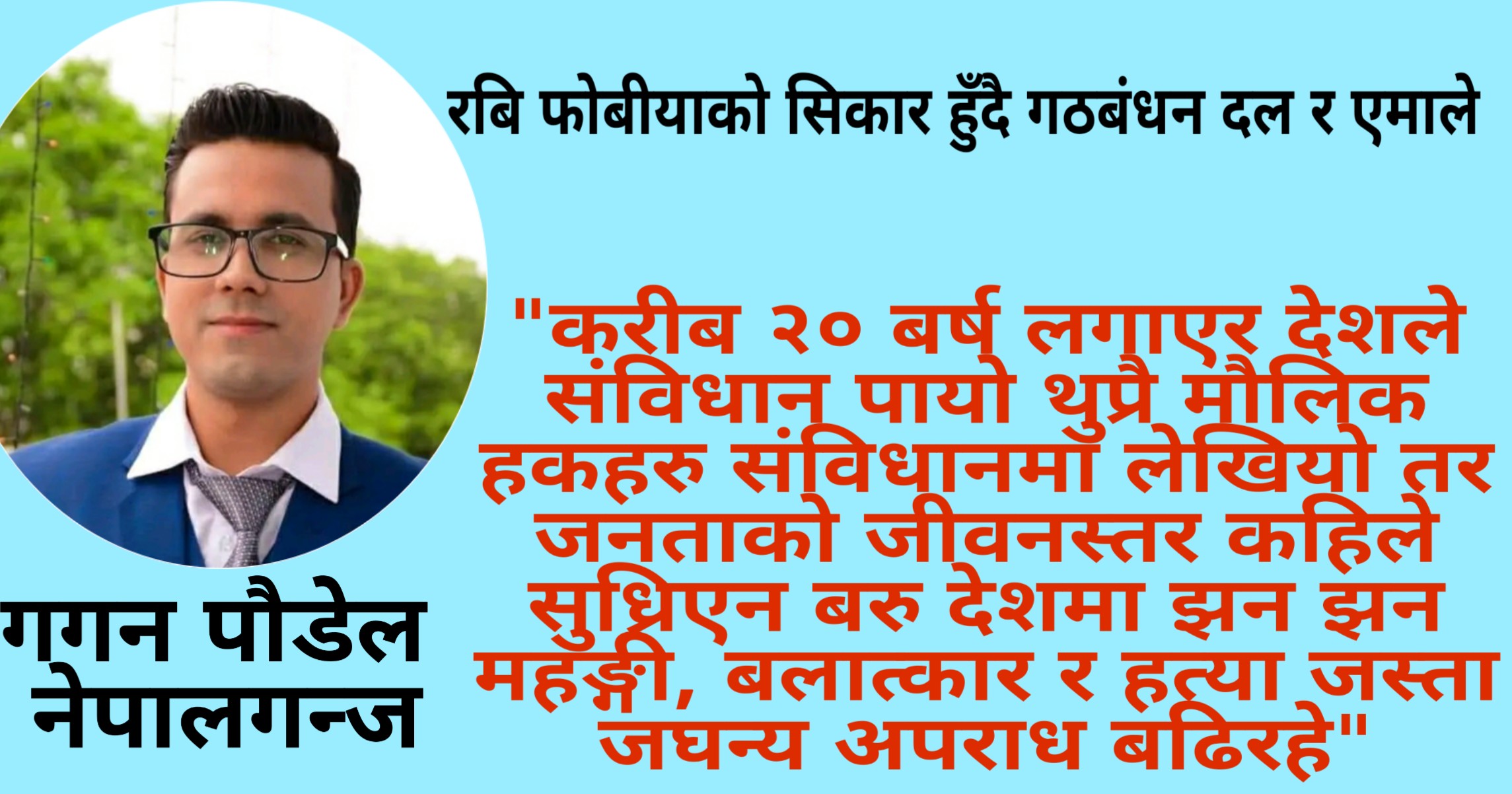 गगन पाैडेल नेपालगञ्जपत्रकार लामिछाने आफ्नो पत्रकारिताको कर्मलाई बिसाउँदै राजनीतिमा पाइला सुरू गरेका छन। पत्रकारिता मार्फत जनताको मन मनमा बसेका रबिको राजनितिक यात्रा, उनले गर्छु भनेको विकाश र समृद्धि भने हेर्न बाँकी नै छ।मंसिर ४ मा संसदीय चुनावको घोषणा सँगै राजनीतिक दल र तिनका भातृ संगठनहरु चुनावी अभियानमा सक्रिय भइरहेका छन। विक्रम संवत २०५२ साल देखि […]