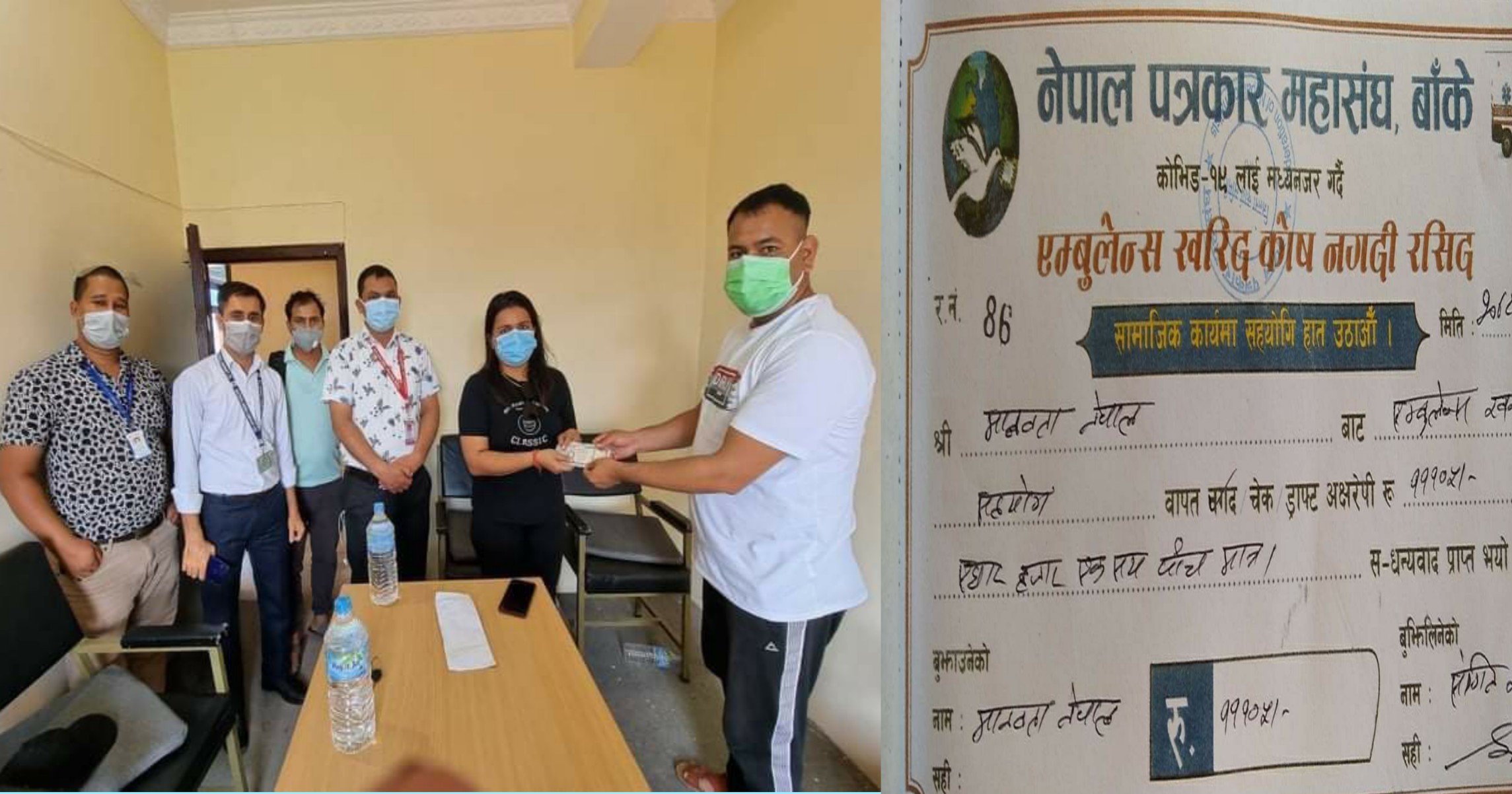 हिजो पत्रकार महासंघ बाँकेका अध्यक्ष दामोदर भण्डारीलाई उक्त रकम मानवता नेपालका सल्लाहकार नमस्कार शाह, संस्थाका सहसचिव नवीन शर्मा, सदस्य नेत्र सापकोटाको उपस्थितिमा हस्तान्तरण गरिएको थियोे ।
