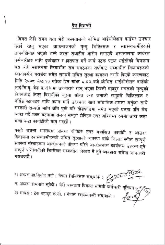 नेपालगन्ज : कोरोना महामारीको भयावह स्थितिमा आफ्नो ज्यानको प्रवाह नगरी दिनरात बिरामीको सेवामा जुटेका चिकित्सक तथा स्वास्थ्यकर्मी माथि गएराति भेरी अस्पताल नेपालगन्जमा दाङ घर भएका कोभिड संक्रमित बिरामी डिल्ली बहादुर रावतको मृत्युु भएको विषयलाई लिएर त्यहाँ कार्यरत रहेका चिकित्सक तथा स्वास्थ्यकर्मीहरुमाथि गरिएको अमानवीय व्यवहारको चौतर्फी विरोध गरि हदैसम्मको कारबाहीको माग गरिएको छ ।