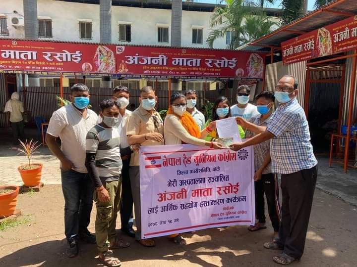 नेपालगन्ज : भेरी अस्पतालमा उपचार गराइरहेका कोभिड बिरामी तथा बिरामीका कुरुवाहरुलाई खाना खुवाएर सामाजिक कार्य गरिरहेको संस्था अन्जनी माता रसोईलाई लाई नेपाल ट्रेड युनियन कांग्रेस बाँके शाखाले आर्थिक सहयोग गरेको छ ।