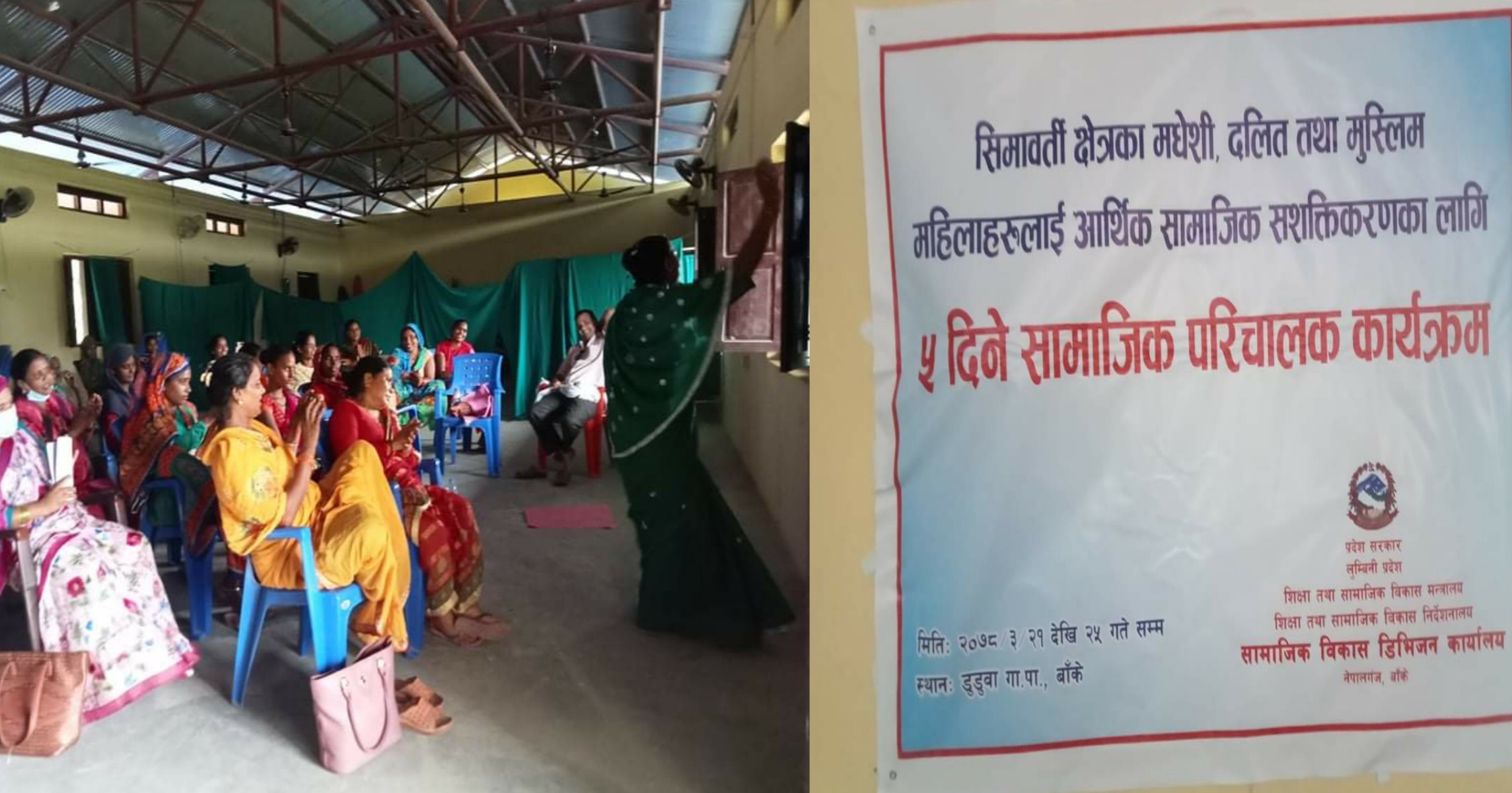 नेपालगन्ज : बाँकेको डुडुवा गाउँपालिकामा सामाजिक विकास डिभिजन कार्यालयको आयोजना सिमावर्ती क्षेत्रका मुस्लिम, मदेशी, दलित महिलाहरुलाई आर्थिक , सामाजिक सशक्तीकरणका लागि सामाजिक परिचालक तालिम सम्पन्न भएको छ ।