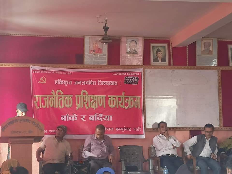 आज बाँकेको कोहलपुरमा बाँके र बर्दियाका नेता तथा कार्यकर्तालाई राजनीतिक प्रशिक्षण दिइएको थियोे । केन्द्रीय सचिवालय सदस्य कमरेड धमेन्द्र बास्तोला (कन्चन)को प्रमुख आतिथ्यमा, बाँके जिल्ला सेक्रेटरी कमरेड अनिलको अध्यक्षतामा कार्यक्रम गरिएको थियोे ।