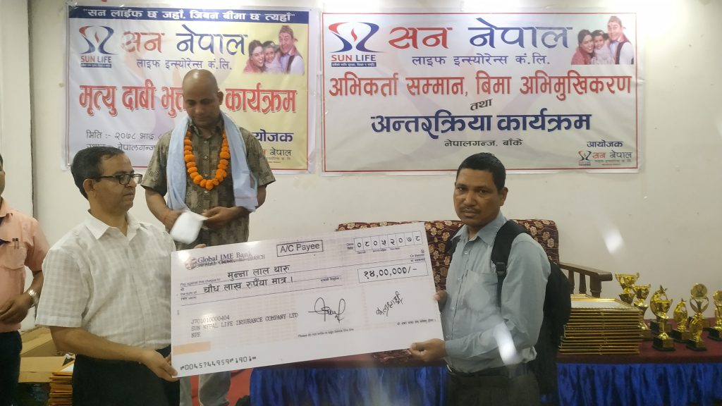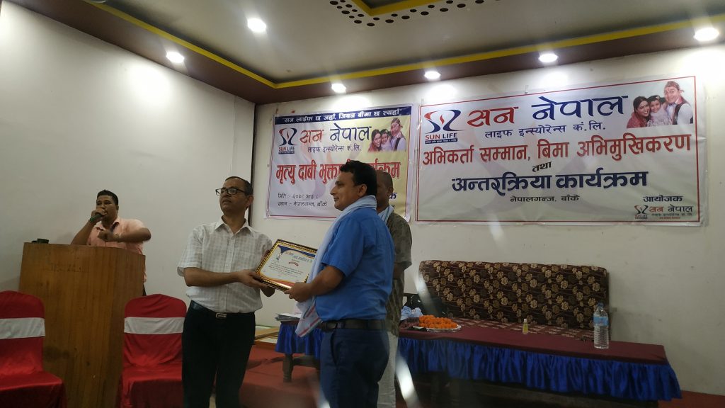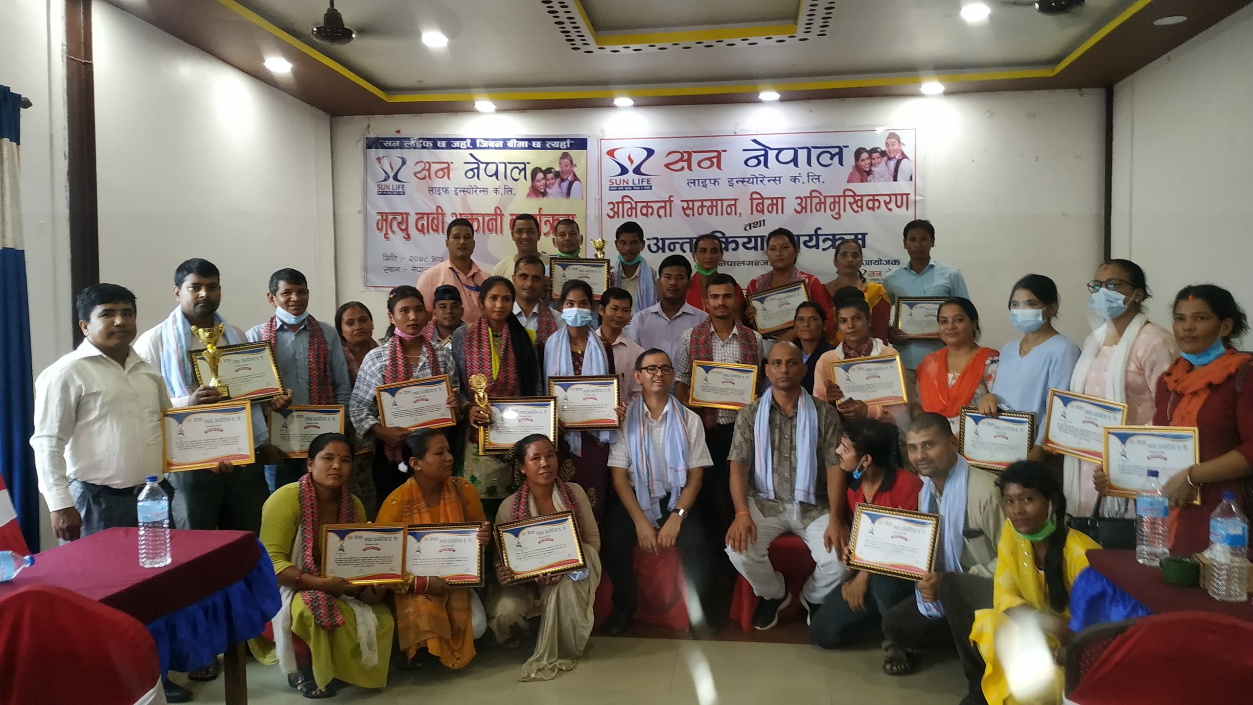 सन् नेपाल लाईफ इन्स्याेरेन्स कम्पनि लिमिटेड, शाखा कार्यालय नेपालगन्जले आर्थिक वर्ष २०७७/०७८ मा उत्कृष्ट व्यवसाय गर्ने सक्रिय अभिकर्ता र व्यवसाय प्रबन्धकहरुलाई प्रमाण-पत्र र ट्रफि सहित सम्मान गरिएकाे नेपालगन्ज शाखा प्रबन्धक कमल शाहीले बताउनुभयाे । उहाँका अनुसार उक्त सम्मानले कार्यक्रममा उपस्थित सबैलाई उत्प्रेरणा मिलेकाे बताउनुभयाे । साे कार्यक्रममा कम्पनीका प्रमुख कार्यकारी अधिकृत राज कुमार अर्याल र सहायक महाप्रबन्धक माेतीलाल भट्टराइले सबै सम्मानित व्यक्तित्वहरुलाई बीमा र त्यसकाे बजारिकरणका बारेमा सहजिकरण गर्नुभएकाे थियाे ।