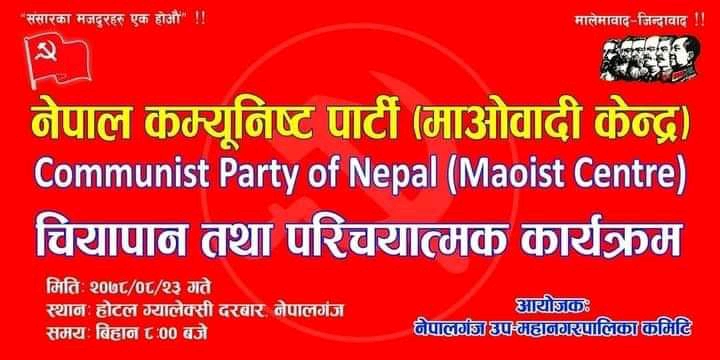 नेपालगन्ज : नेपाल कम्युनिस्ट पार्टी माओवादी केन्द्र नेपालगन्ज उपमहानगरपालिका कमिटीले भोलि चियापान तथा परिचयात्मक कार्यक्रम गर्ने भएको छ ।