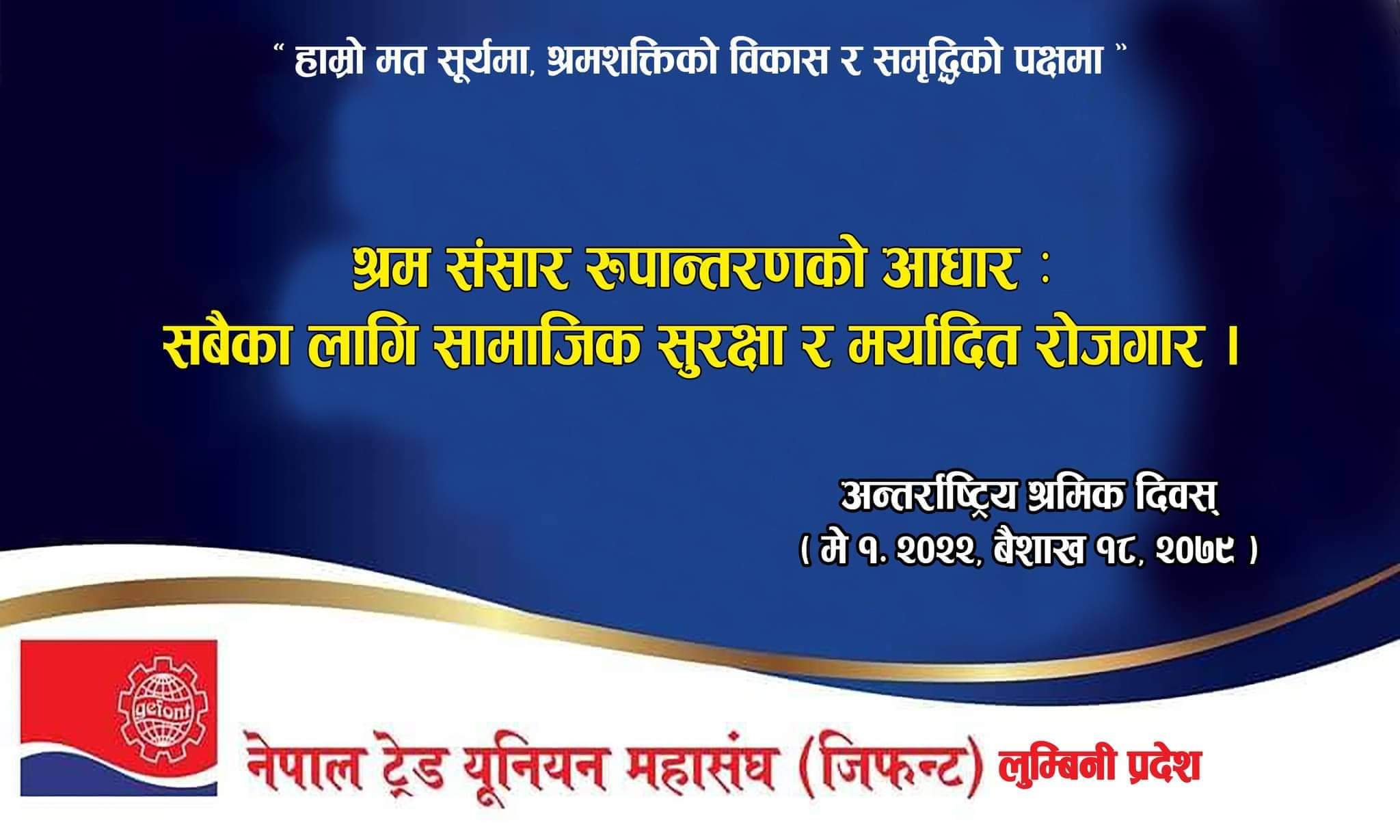 नेपालगन्ज : नेपाल ट्रेड युनियन महासंघ (जिफन्ट) बाँकेको आयोजनामा मे फस्ट अर्थात बैशाख १८ गते आइतबारका दिन भव्य रुपमा अन्तर्राष्ट्रिय मजदुर दिवस मनाउन गइरहेको छ ।