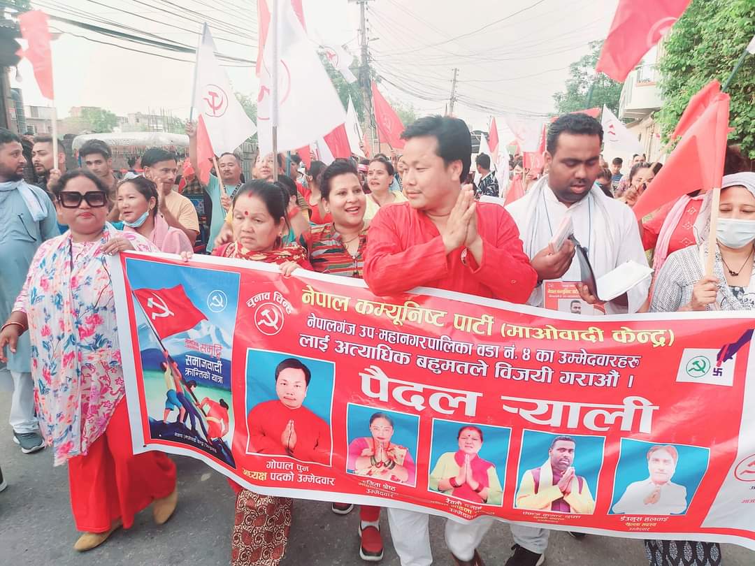 नेपालगन्ज : आसन्न स्थानीय तहको निर्वाचनमा नेपालगन्ज उपमहानगरपालिका वडा नं ४ बाट नेकपा माओवादी केन्द्रबाट वडा अध्यक्षमा उठेका आदिवासी जनजातिका गोपाल पुनलाई जनताको माया,हौसला र उनीहरुको टीमलाई जिताउने प्रतिबद्धता व्यक्त गर्दै स्थानीयहरुको जनसागर उर्लिएको छ ।