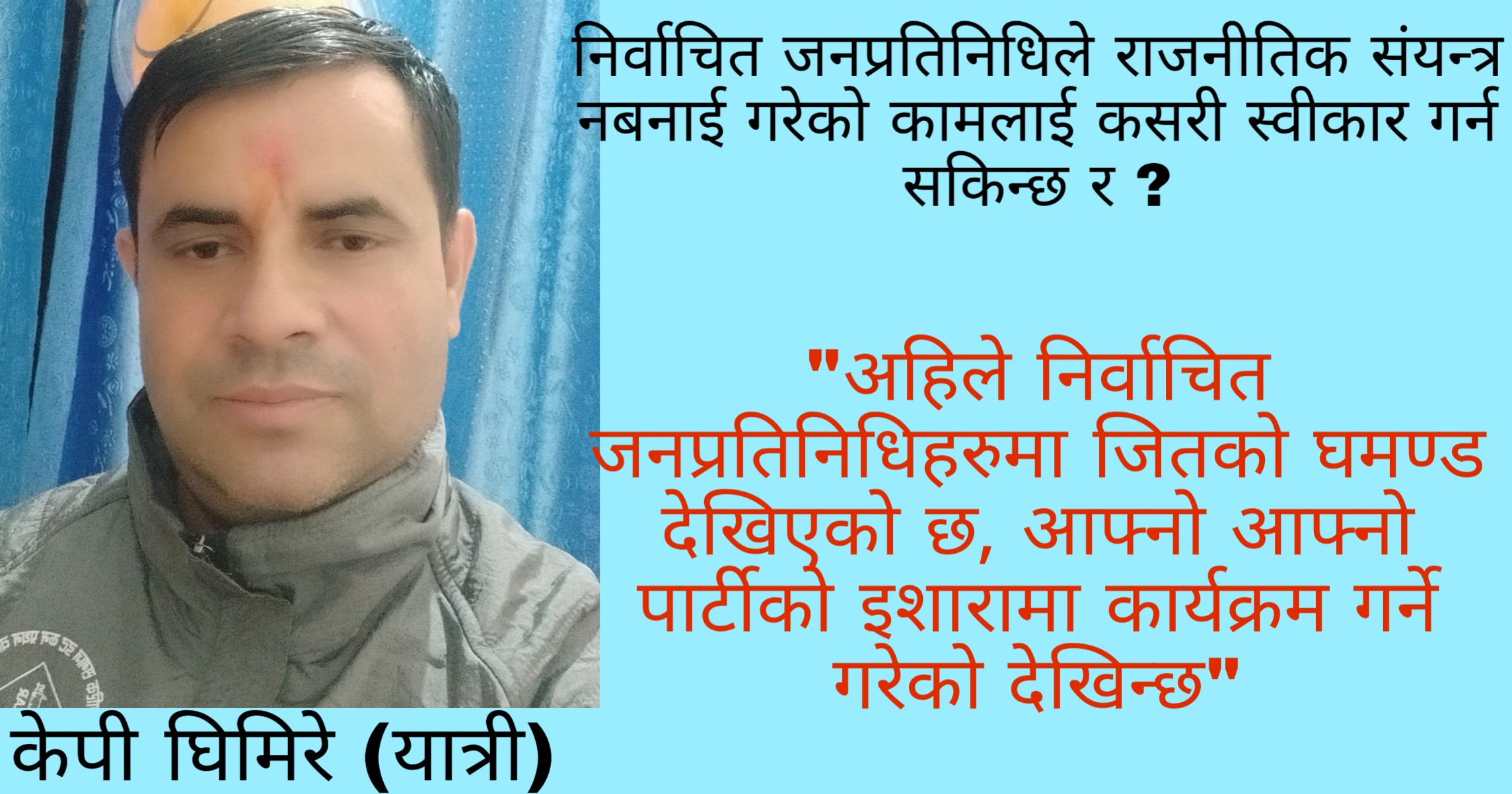 स्थानीय निर्वाचन २०७९ बैशाख ३० गते भर्खर सकिएको छ , देशभर का स्थानीय निकायमा जनप्रतिनिधिहरुको अन्तिम नतिजा केही ठाउँमा बाहेक अधिकांश ठाउँको आइसकेको छ । अहिले निर्वाचित जनप्रतिनिधिहरुमा जितको घमण्ड देखिएको छ, आफ्नो आफ्नो पार्टीको इशारामा कार्यक्रम गर्ने गरेको देखिन्छ र सोही अनुसार गरेको भन्ने बुझ्नमा आएको छ ।