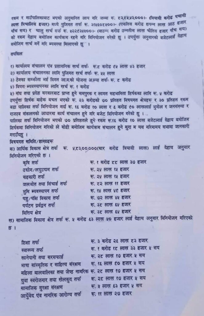 यसपालिको बजेटले शिक्षा र कृषिमा मा बढी जोड दिएको छ । शिक्षा तर्फ ३ करोड २६ लाख ८३ हजार र कृषि तर्फ १ करोड ८८ लाख ३७ हजार बजेट विनियोजन गरिएको छ ।
