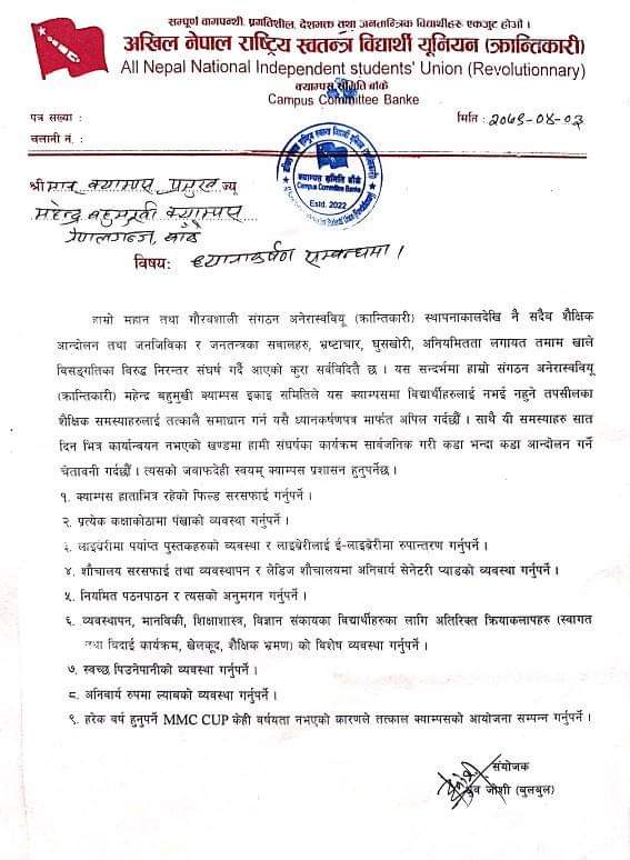 नेपालगन्ज : अखिल क्रान्तिकारी महेन्द्र बहुमुखी क्याम्पस इकाई समितिले बुझायो क्याम्पस प्रमुखलाई ध्यानाकर्षण पत्र बुझाएको छ ।