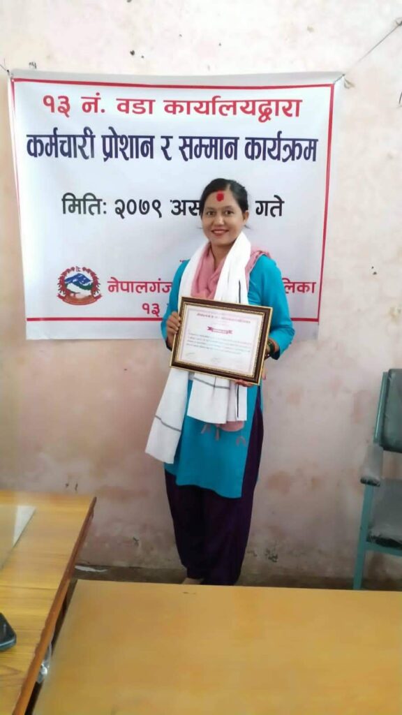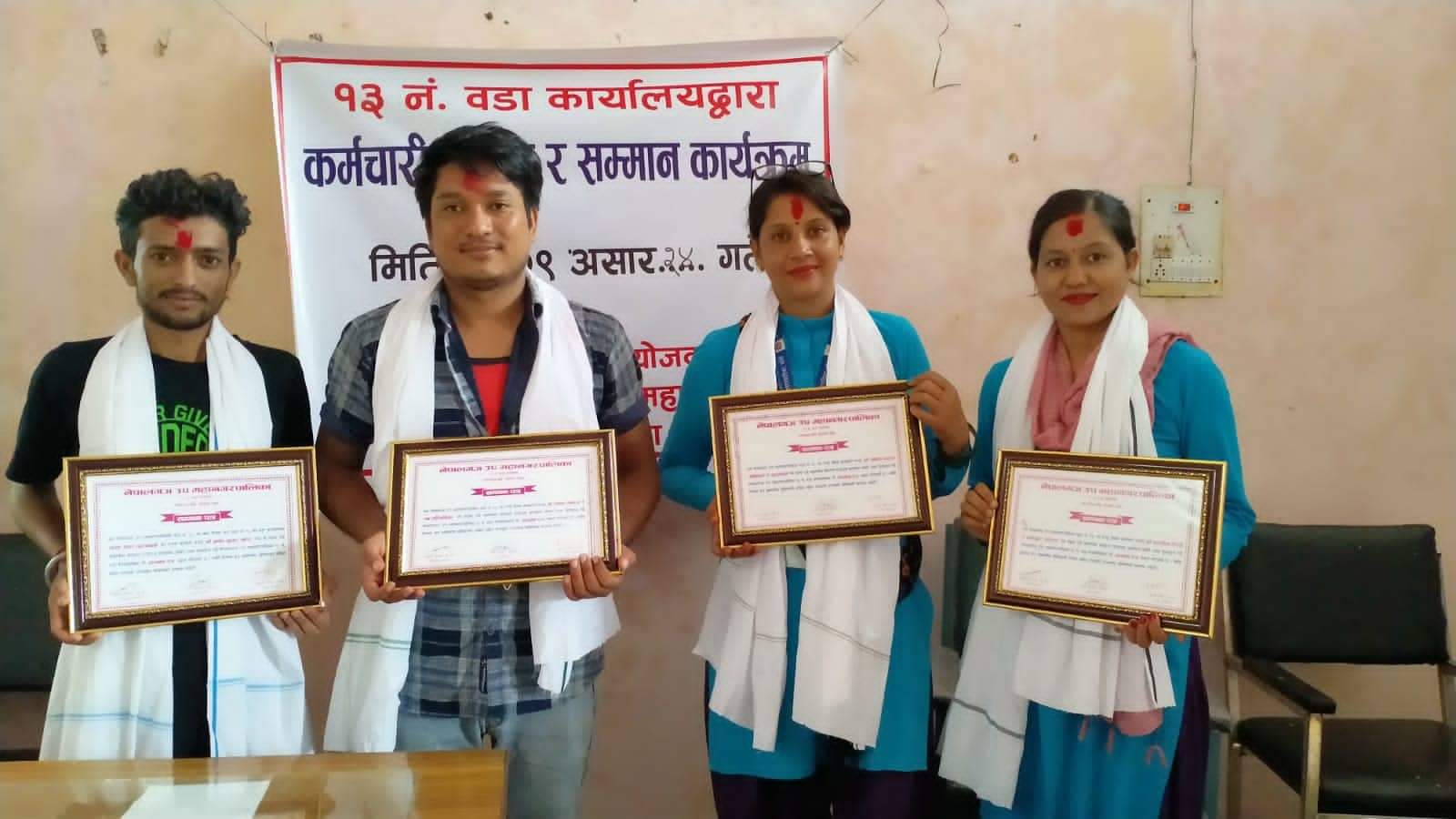 उदयपुर स्थित १३ नम्बर वडा कार्यालयमा रहेका कर्मचारीमध्ये उत्कृष्ट सेवा प्रदान गरेको र कार्यालयको गरिमा उच्च राख्ने गरि जनप्रतिनिधिलाई सहयोग गरेको मुल्याङ्कनका आधारमा कार्यालयले सम्मान गरेको हो ।