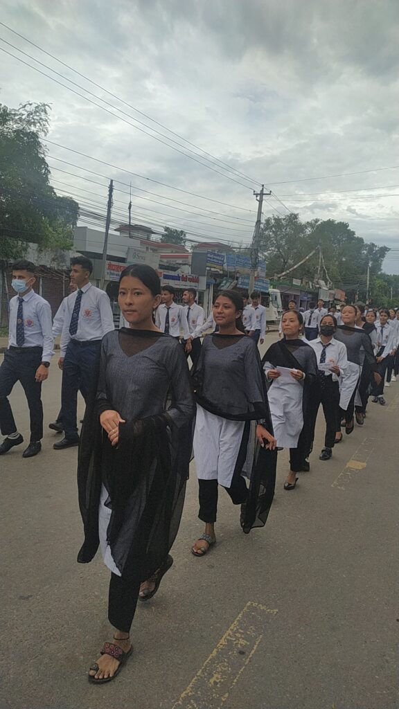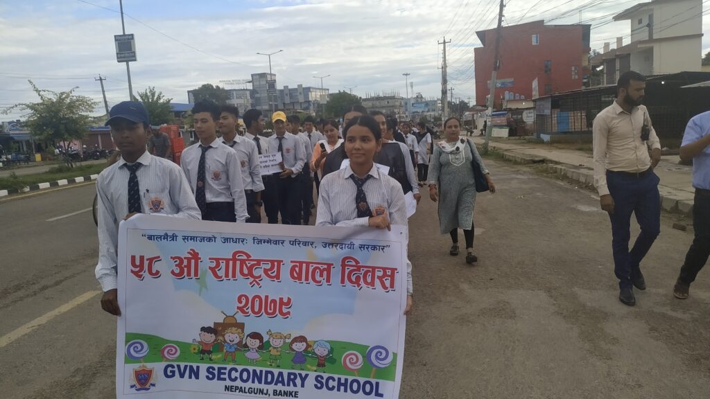बाल शोषण गर्न पाइदैन, बाल बिहाहको अन्त्य गरौं, राष्ट्रिय बाल दिवस सफल पारौं लगायत लेखेको प्लेकार्ड बोकेर, नारा लगाउदै प्रभातफेरी गरिएको थियोे । विद्यालयका संयोजक खुमलाल शर्मा, विद्यालयका सह प्राचार्य दिपेन्द्र शर्मा, विद्यालयका इन्चार्ज केपी घिमिरे, विद्यालयका शिक्षीका जमुना क्षेत्री , प्रतिभा आचार्य लगायतको टीमले उक्त प्रभात फेरिलाई नेतृत्व गर्नुभएको थियोे भने र्यालीमा सयौंको सङ्ख्यामा विद्यार्थीहरुको उपस्थिति रहेको थियोे ।