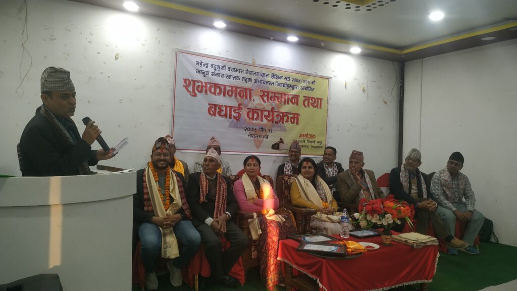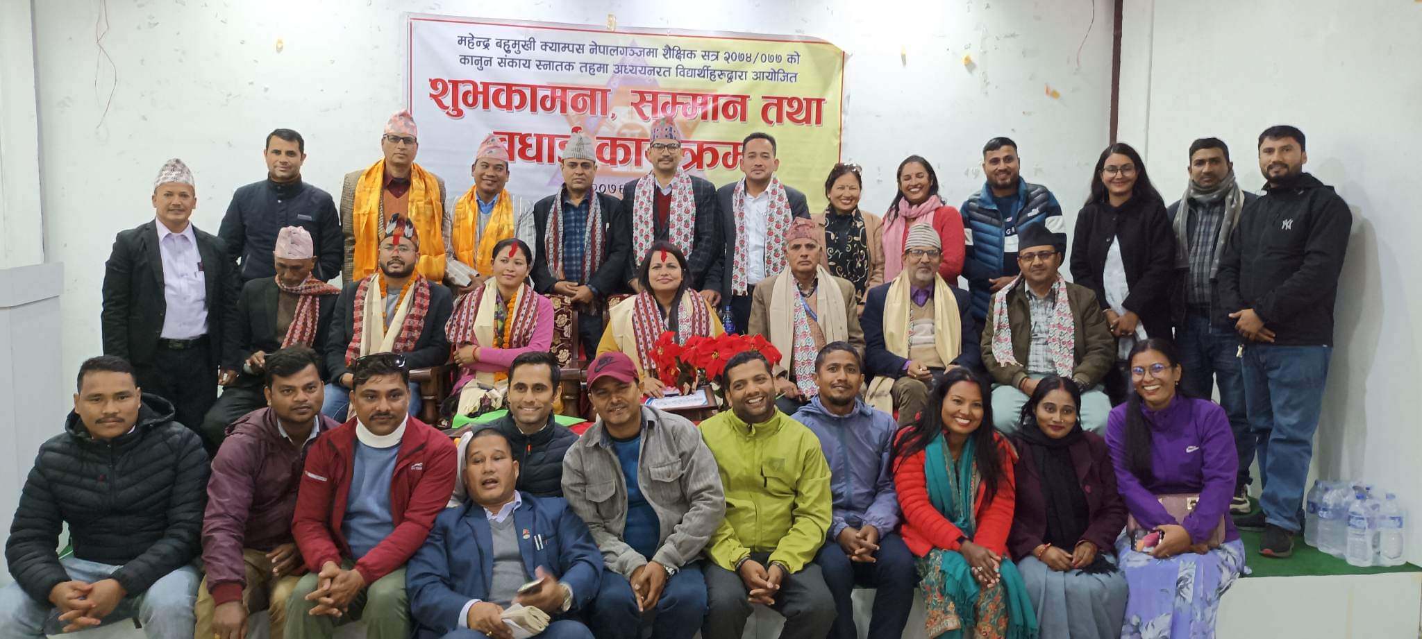 नेपालगन्जको स्वस्तिक होटेलमा भएको कार्यक्रममा कानुन संकायक प्राध्यापक तथा विद्यार्थीहरुको बाक्लो उपस्थित रहेको थियोे । उक्त कार्यक्रममा स्वागत मन्तव्य शंकर न्यौपानेले गरेका थिए । ७४ वर्षका विद्यार्थी बलभद्र वलीको अध्यक्षतामा सप्पन्न कार्यक्रमको सन्चालन कुल बहादुर रजाली र कमल शाहीले गरेका थिए । कार्यक्रममा सम्मान पत्र सहित दोसल्ला ओढाएर सम्मान गरिएको थियो । उक्त कार्यक्रममा क्याम्पस प्रमुख लालमणि आचार्य तथा पुर्व क्याम्पस प्रमुख गणेश रेग्मीलाई दोसल्ला ओढाएर सम्मान गरिएको थियो । ।