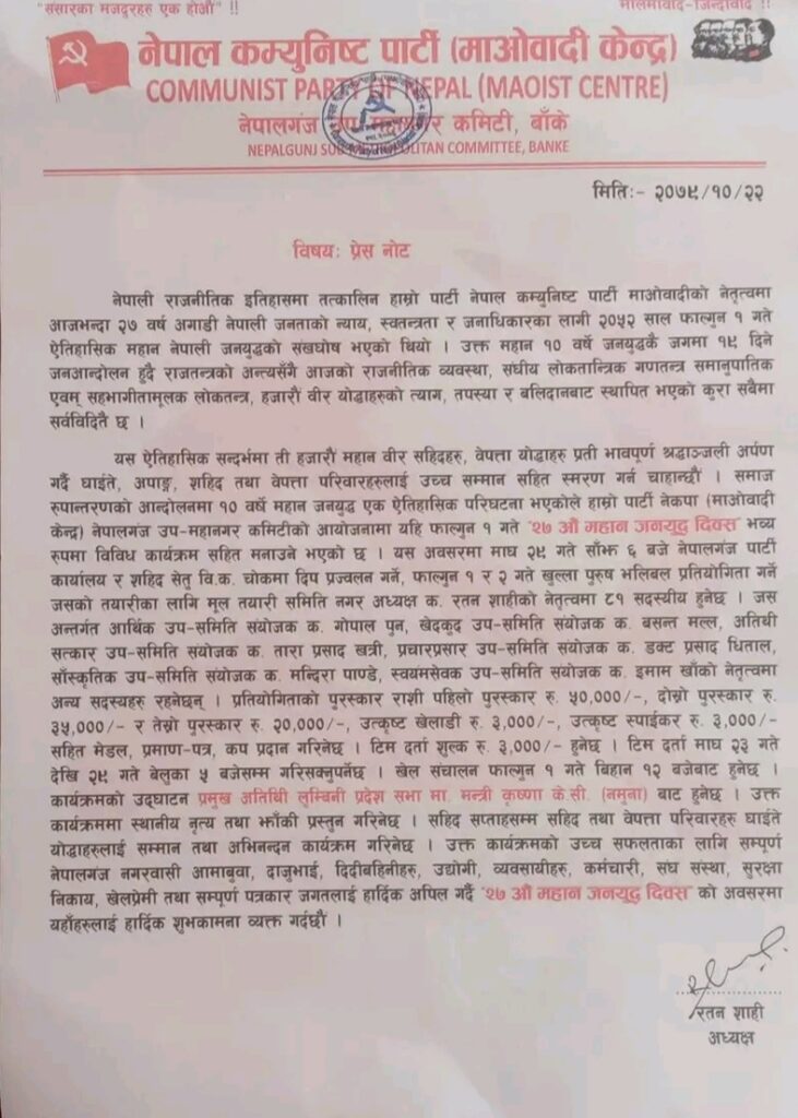 आज पत्रकार सम्मेलनमार्फत जानकारी दिदै नेपालगन्ज उपमहानगरपालिका नगर अध्यक्ष तथा लुम्बिनी प्रदेश सदस्य रतन शाहीले फागुन १ र २ गते नगरले विविध कार्यक्रम सहित जनयुद्ध दिवस भब्य रुपमा मनाउने निर्णय गरिएको बताउनुभयो । उक्त दिवसको अवसरमा पुरुष खुल्ला भलिबल प्रतियोगिता, सांस्कृतिक कार्यक्रम लगायतका कार्यक्रम गरिने उहाँले बताउनुभयो ।