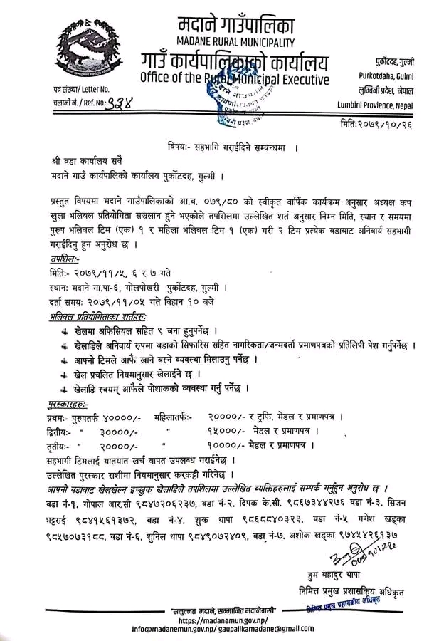 गुल्मी : गुल्मीको मदाने गाउँपालिकाले वडा स्तरीय भलिबल प्रतियोगिता आयोजना गर्ने भएको छ ।