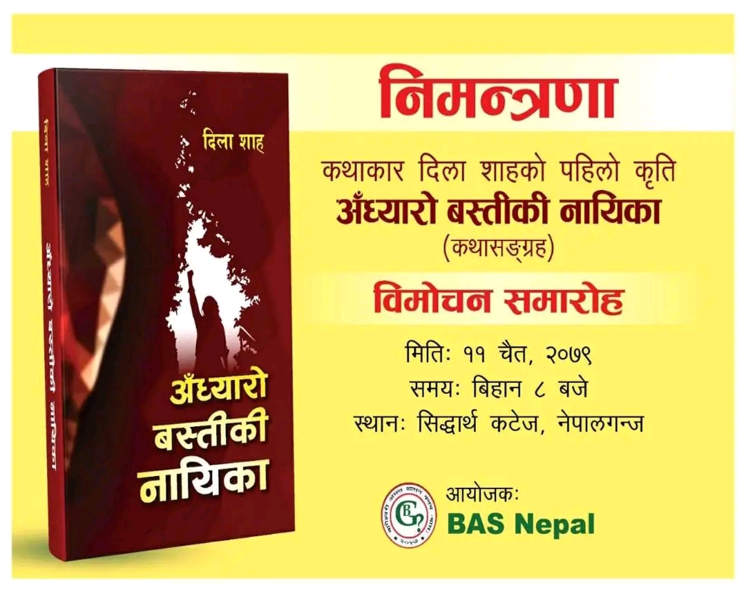 नेपालगन्ज : बास नेपाल कि केन्द्रीय सचिव कथाकार दिला शाहको अँध्यारो बस्तीकी नायिका कथा सङ्ग्रह भोलि विमोचन हुने भएको छ ।
