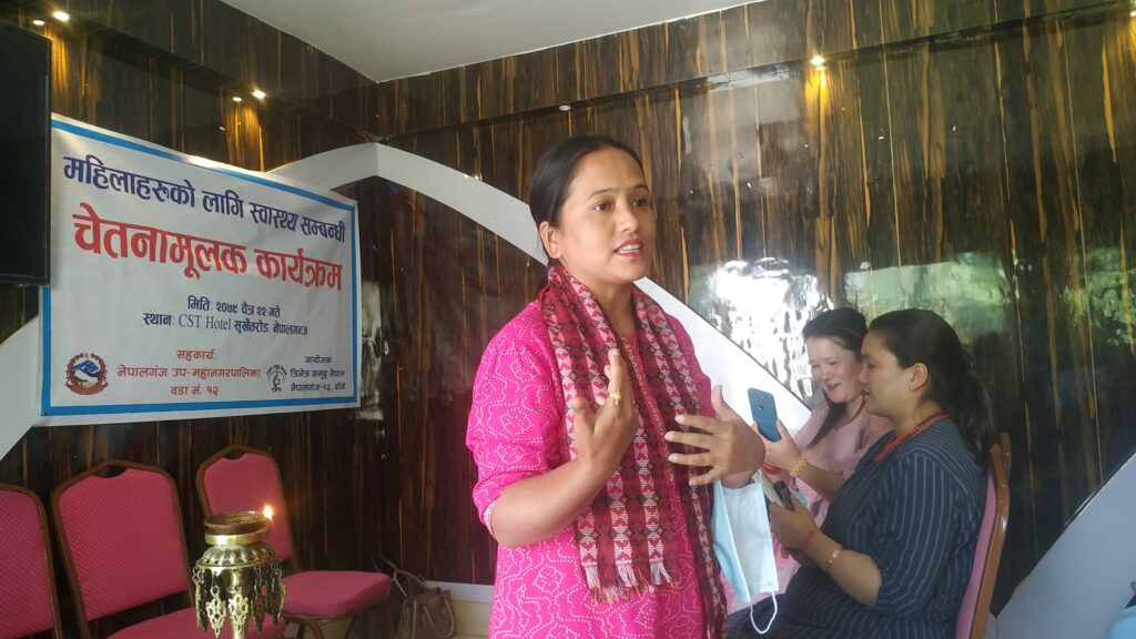 नेपालगन्ज : सामाजिक क्षेत्रमा आफ्नो उल्लेखनीय कार्य गर्दै आइरहेको त्रिनेत्र समृद्ध नेपाल संस्थाको आयोजनामा नेपालगन्ज उपमहानगरपालिका वडा नं १२ मा महिलाहरुको लागि स्वास्थ्य सम्बन्धि जनचेतनामूलक कार्यक्रम गरेको छ ।