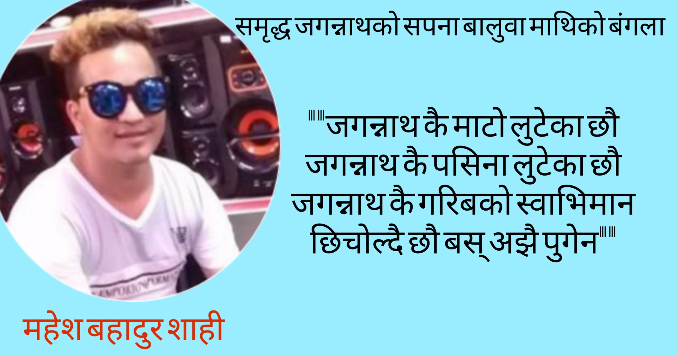 परिर्वतन पनि देखेका छौ अनि अरुको सहायल मय जीवन पनि देखेका छौ जीवन जिउने तरिका र रहन सहन पनि देखेका छौ । जगन्नाथले मुक्तिको शाहस फर्ने सेवा एकलौटी कर्मचारी एकलौटी कुनै एनजीओ आईएनजिओ सेवा तालिम एकलौटी पेट नपोलेर पिठियौं कहिले सम्म हो । म रैथान अनि जन्मसिद्ध अधिकार को धावा मा बोल्ने । अधिकारको सबैमा सुनिश्चित बनाउने र बन्ने सबैको नजर सहिलाइ सहि र गलत लाई गलत साबित गरियोस् । अन्यको बिरुद्वमा सबैमा जनचेतनामूलक अभियानको बिगुल फुकेकै छौ फुक्छौ पनि । अधिकार लाई छिचोल्दै अगाडि बड्ने ती पाखण्डिहरुलाई चेतनाको झिल्को या बाटो हाल्नै पर्छ । आसे पालेका छौ पासे मोटाका छन् अनि मरेको गोरुको भान जगन्नाथ लाई किन कति सम्म हर्कत गर्छौ कति सम्म मरेको गोरुको मासु खान्छौं ? मन परि छ है तन्त्र आफ्नै शासन आफ्ने नीति आफ्नै भए र हो कि नेपालको जगन्नाथ छुट्टै तिम्रो पुर्खाले आर्जेको मुलुक हो ? बाबा गणतन्त्र उधमान छ लोकतन्त्र उधमान छ । खोइ जगन्नाथमा लोकतन्त्र भान गणतन्त्र भान अब राज्यलाई ढक्कक्याने पर्ने भयो आँखा हेर्दा हेर्दै चिम्लेको भान छ, जगन्नाथमा । कठै बरा कति सोजा कति निमुखा कति सम्म अन्याय को भारी बोक्न तयार हामी है जवाफ आफैमा भरिपुर्ण छ । घाँटी गला च्यापियको छ तर कति मीठो हाँसो छ है । सुन र पितल पनि थाहा छ है तै पनि पितललाई सुन नै देख्छौ । भोकमा हराएको जनावर भोगकै सपनाको मर्जन बन्न छ, अनि समृद्ध समृद्ध सबै हेक्का भईसक्यो ।