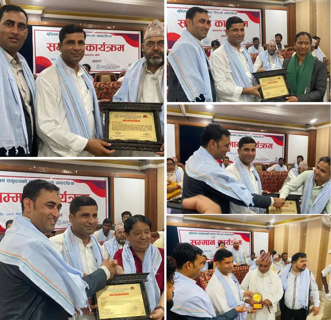 मुस्लिम जर्नलिस्ट क्लब नेपालले नेपालगञ्जमा बिहीबार आयोजना गरेको ‘मुस्लिम समुदायको सवाल विषयक अन्तरक्रिया र सम्मान कार्यक्रम’ मा उक्त सम्मानहरू प्रदान गरिएको मुस्लिम जर्नलिस्ट क्लब नेपालका अध्यक्ष आलम खानले बताए ।