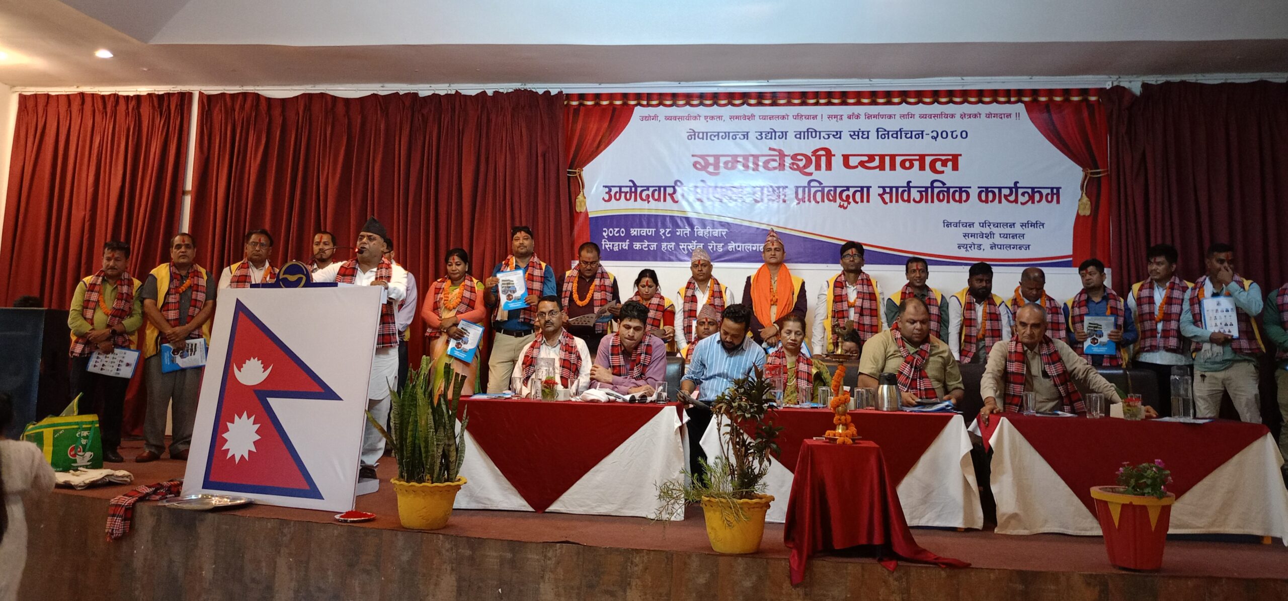 नेपालगन्ज उद्योग वाणिज्य संघको निर्वाचनका लागि समावेशी समुहको तर्फबाट टंक बहादुर धामीको अध्यक्षतामा २१ सदस्यीय प्यानलका सबै उम्मेदवारहरुको व्यक्तिगत परिचय दिदै उम्मेदवारी घोषणा गरिएको हो ।