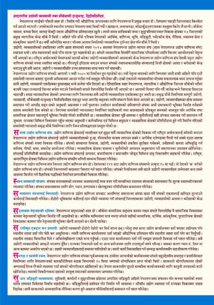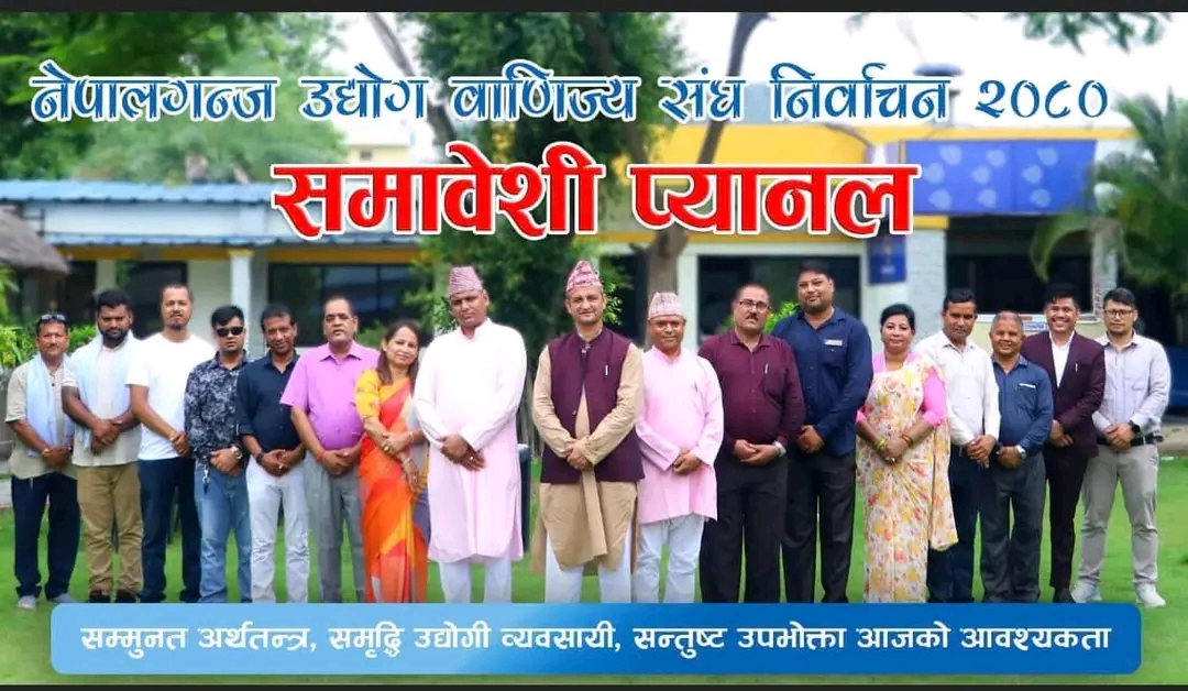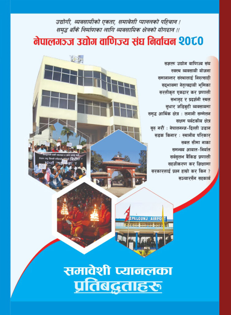 नेपालगञ्ज उद्योग वाणिज्य संघको आगामी २ भदौ २०८० मा निर्वाचन हुन गइरहेको छ । नयाँ नेतृत्व चयनको लागि विगतमा जस्तै हामी अहिले पनि एउटै समावेशी प्यानल बनाएर चुनावी अभियानमा आउन पाउँदा गर्व महसुस गरिरहेका छौं । हाम्रो एकताले व्यवसायीका बीचमा सकारात्मक भाव उत्पन्न गर्नुका साथै उद्योगी, व्यवसायी एकढिक्का हुनसक्छन् भन्ने सन्देश पनि दिएको छ । ऐतिहासिक सहर नेपालगञ्ज र व्यापारिक र औद्योगिक जिल्ला बाँकेको गरीमा कायमै राख्न राज्यलाई निरन्तर सचेत गराउने जिम्मेवारी संघले विगतदेखि निर्वाह गर्दै आएको छ र आगामी दिनमा पनि गर्दै जानेछ भन्ने विश्वास दिलाउन चाहन्छौं । समग्र व्यावसायिक क्षेत्रको उत्थानका लागि जिल्लाका सबै उद्योगी व्यवसायीहरु एकढिक्का हुन जरुरी छ । समृद्ध बाँके निर्माणमा सम्पूर्ण उद्योगी, व्यवसायी, बाँकेबासी दाजुभाइ र दिदीबहिनीहरु एकजुट भएर अगाडि बढ्नका लागि संकल्प लिने बेला आएको छ । उद्योगी, व्यवसायीहरुका हरेक समस्या समाधान गरी अगाडि बढ्न सक्ने अनुभवी अग्रजहरु र नयाँ पुस्ताका उर्जावान साथीहरुको समिश्रणले संघमा अझै प्र्रभावकारी भूमिका निर्वाह गर्नसक्ने सशक्त समावेशी टिम बनेको छ । विगतमा समावेशी प्यानलबाट निर्वाचित पदाधिकारी तथा सदस्यहरुले प्रतिकूल समयको बाबजुत पनि आर्थिक तथा सामाजिक क्षेत्रमा महत्वपूर्ण भूमिका निर्वाह गरेको सर्वविदितै छ । व्यवसायिक क्षेत्रका थुप्रै समस्या र चुनौतीलाई सही ढंगबाट समन्वय गरी समाधान गर्ने जुझारु, राज्यका विभिन्न निकायमा पहुँच भएका अनुभवी, कर्तव्यनिष्ठ एवं विभिन्न समुदाय र व्यवसायिक क्षेत्रको प्रतिनिधित्व हुने गरी निर्माण गरिएको समावेशी प्यानलले समृद्ध बाँके निर्माणका लागि निम्न प्रतिबद्धताहरु प्रस्तुत गरेको छ :