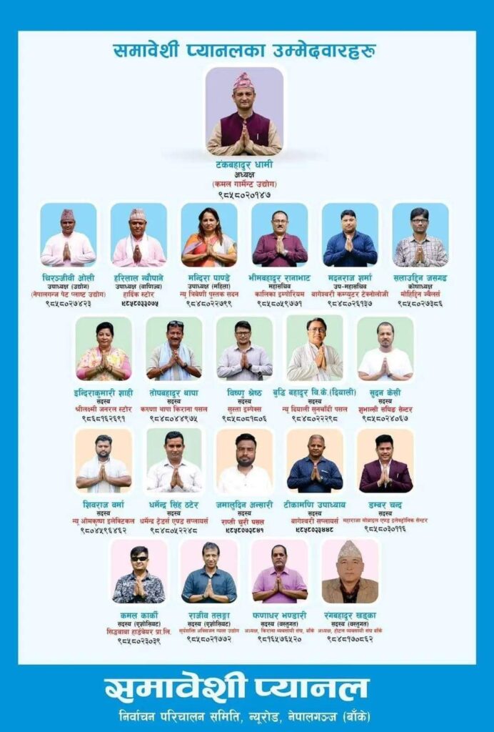नेपालगन्ज : नेपालगन्ज उद्योग वाणिज्य संघको भदौ २ गते हुन गइरहेको निर्वाचनका लागि दुईवटा प्यानल चुनावी मैदानमा रहेका छन् । सोही क्रममा टंक बहादुर धामी नेतृत्वको समावेशी प्यानलबाट सदस्य पदमा उम्मेदवार दिएका टिकामणि उपाध्याय एक सफल व्यवसायी रहेका छन् ।