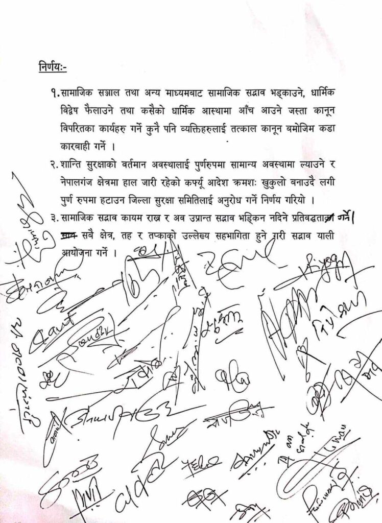 उक्त सर्वदलीय बैठकले तीनवटा निर्णय गरेको छ । सामाजिक सञ्जाल तथा अन्य माध्यमबाट सद्भाव भड्काउने, कसैको धार्मिक आच आउने गतिविधि गर्ने जोकोहीलाई पनि कानुन बमोजिम कारबाही गर्ने, शान्ति सुरक्षाको वर्तमान अवस्थाबाट क्रमश कर्फ्युलाई खुकुलो पार्दै लैजाने तथा धेरै भन्दा धेरै सबै तप्का, क्षेत्र र व्यक्तिको उपस्थित गराएर सामाजिक सद्भाव र्यालि निकाल्ने निर्णय गरिएको हो ।