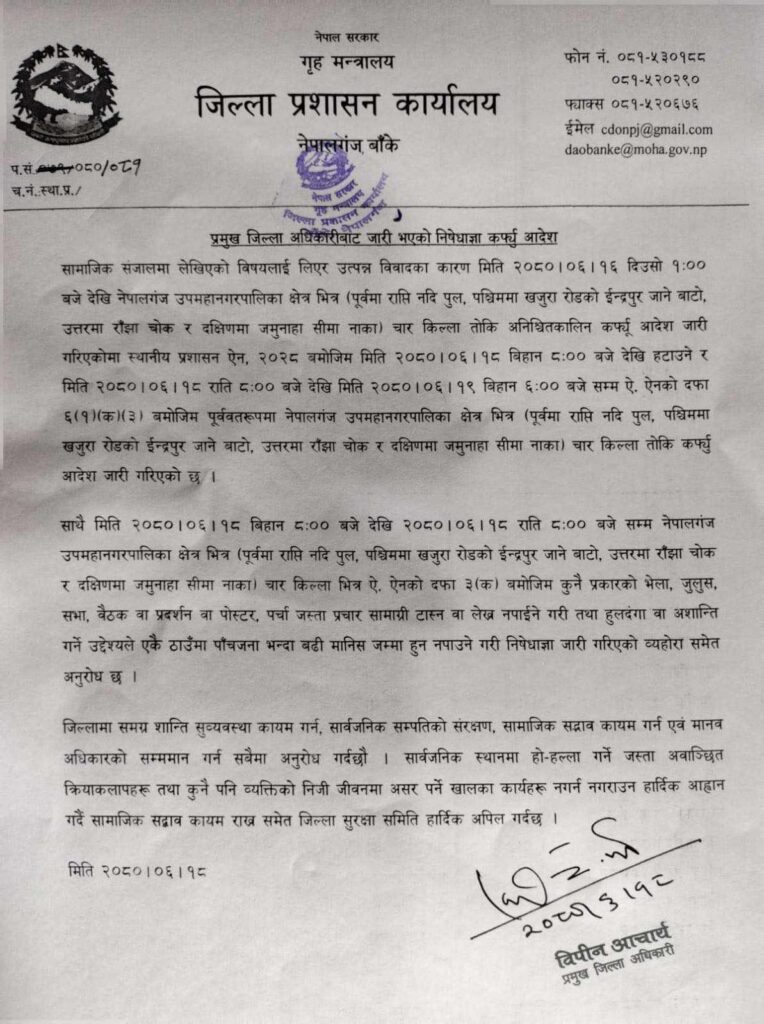 नेपालगन्जमा लगाइएको कर्फ्यु बिहिवार बिहान ८ बजेदेखि साँझ ८ बजेसम्म हटाइएको छ भने रातको समयमा यथावत् राखिएको बाँकेका प्रमुख जिल्ला अधिकारी विपिन आचार्यद्वारा जारी गरिएको सूचनामा उल्लेख गरिएको छ ।