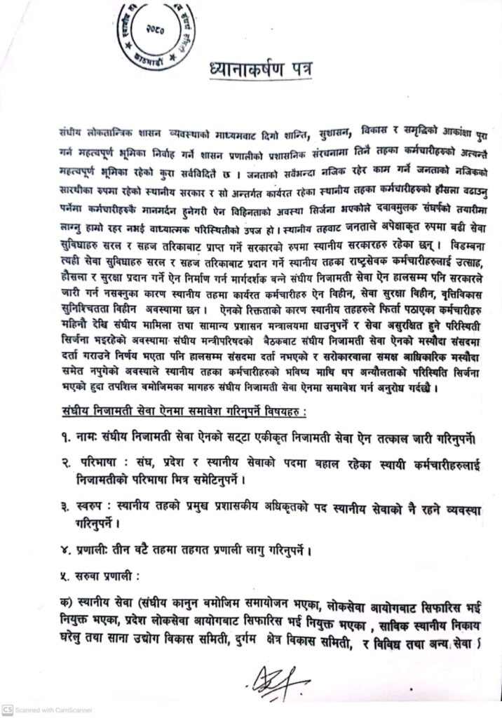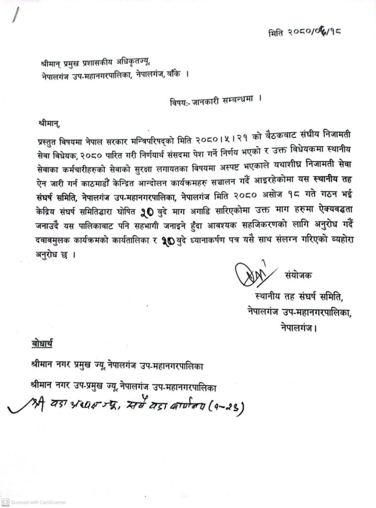 नेपाल सरकार मन्त्री परिषदको मिति २०८० भदौ २१ गतेका दिन बसेको बैठकबाट संघीय निजामती विधेयक २०८० पारित गरि संसदमा पेश गर्ने निर्णय भएको र उक्त विधेयकमा स्थानीय कर्मचारीहरुको सेवा सुरक्षा लगायतका विषयहरु अस्पष्टता रहेको हुदा काठमाण्डौं केन्द्रीय आन्दोलनका कार्यक्रमहरु भएकोमा नेपालगन्ज उपमहानगरपालिका स्थानीय सङ्घर्ष समिति गठन भई केन्द्रीय समितिद्वारा घोषणा गरिएका २० बुदे माग अघि सारिएको हुदा उक्त मागहरुलाई ऐक्यबद्धता जनाउदै नेपालगन्ज उपमहानगरपालिका अन्तर्गत रहेका २३ वटै वडामा पनि भोलि देखि आन्दोलनका कार्यक्रम राखिएको उक्त कार्यक्रममा संयोजक तेजेन्द्र रोकायले बताए ।