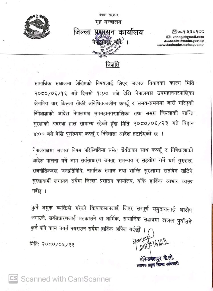 आज जिल्ला प्रशासन कार्यालय बाँकेका सहायक प्रमुख जिल्ला अधिकारी टोपेन्द्र बहादुर के.सी.ले एक विज्ञप्ति निकाली नेपालगन्ज शहर पछिल्लो समयमा शान्त बन्दै गएको हुदा कर्फ्यु र निषेधाज्ञा आज बिहान ४ बजेदेखि पुर्ण रुपमा हटाइएको बताएका छन् ।