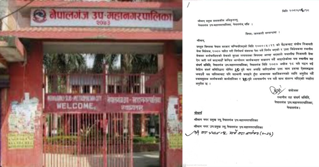 नेपालगन्ज – असोज १३ देखि देशका ७ सय ५३ वटै स्थानीय तहका कर्मचारीहरुले आफ्नो २० बुदे माग राखि केन्द्रिय संघर्ष समितिले तयार पारेको आन्दोलनका कार्यक्रम बमोजिम बाँकेका स्थानीय तहमा पनि संघर्ष समिति गठन गरी आन्दोलन गरिएको छ ।