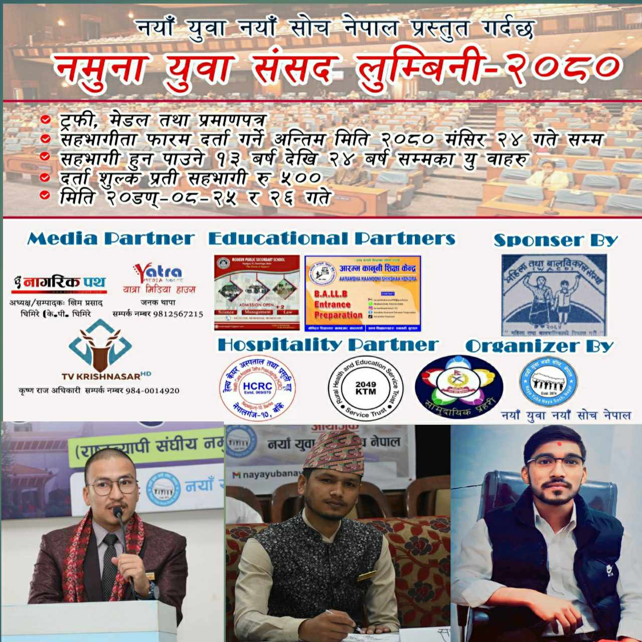 नेपालगन्ज – “नयाँ युवा नयाँ सोच नेपालको” आयोजना तथा नेपालगञ्जका केही संघ संस्थाहरुको आर्थिक सहयोगमा नेपालको संघिय संसदीय अभ्यास बारे प्रशिक्षण दिन एवं सहभागीहरुलाई व्यवस्थापीका एवं कार्यपालिकाको विभिन्न जिम्मेवारी प्रदान गरि व्यवहारिक अनुभव गराउने उद्देश्यका साथ १३ देखी २४ बर्ष उमेर समुहका करिब १२० जना बढी युवाहरुको सहभागीतामा नमुना युवा संसद लुम्बिनी २०८० दोस्रो संस्करण यहि मंसिर २५ र २६ गते नेपालगञ्जमा आयोजना हुने गरिने भएको छ ।