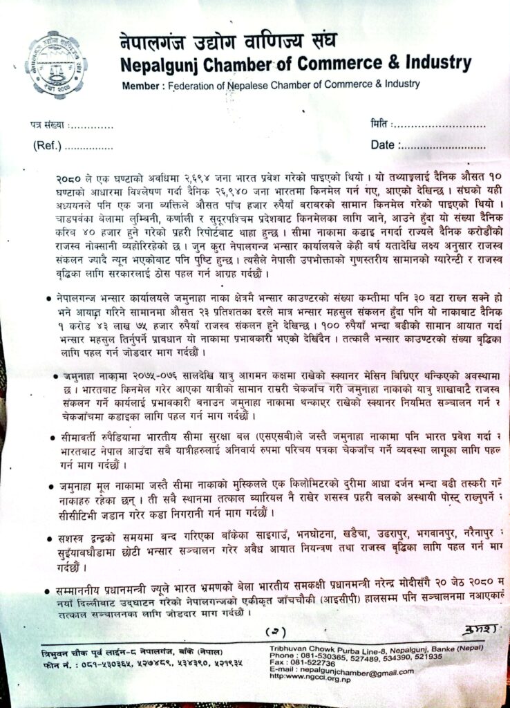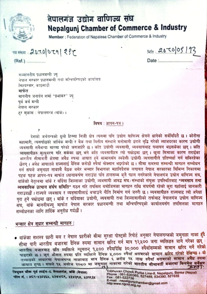 नेपालगन्ज सहर नजिक रहेको जमुना भन्सार जस्तै दर्जन भन्दा बढी नाकाबाट सामानहरु तस्करी गरि ल्याउने गरेको हुदा नेपालगन्जका व्यवसायीलाई मर्का परेको, सशस्त्र द्वन्द्वको समयमा बन्द गरिएका बाँकेका साइगाउ, भनघोटना, उढरापुर, भगवानपुर, नरेनापुर, सुइयाबघौडा लगायतका छोटी भन्सार सञ्चालन गर्न उक्त ज्ञापनपत्रमा माग गरिएको छ ।