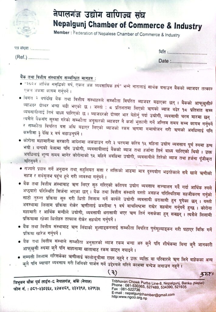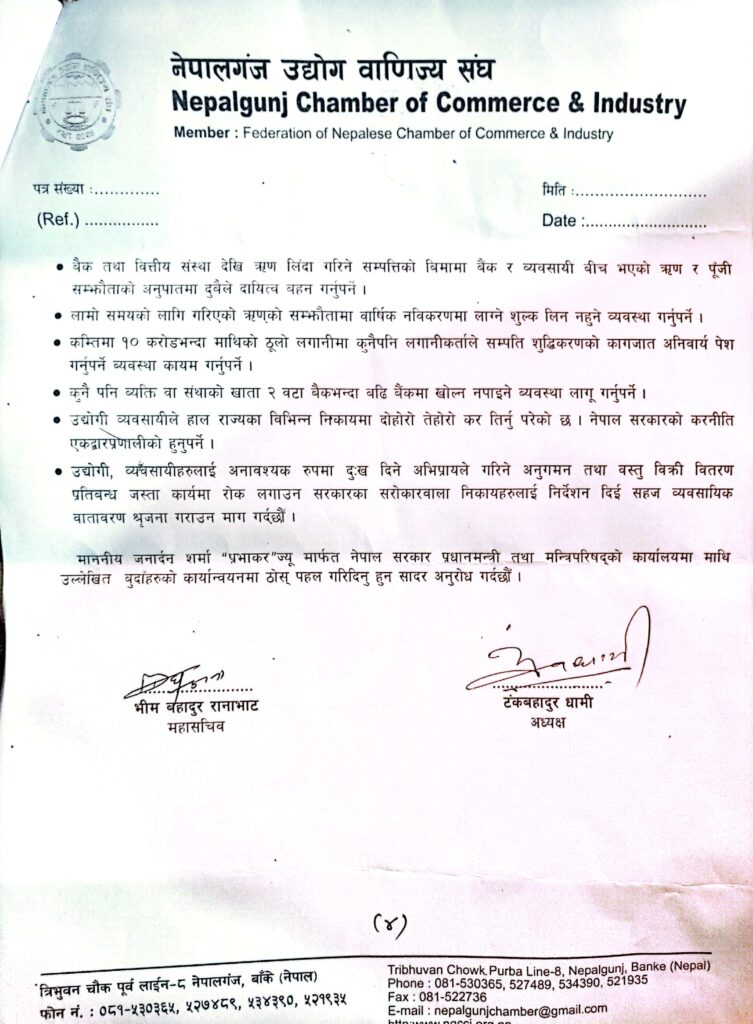 बैंक तथा वित्तीय संस्थाले संम्झौता अनुसारको व्याजदर भन्दा अरु शीर्षकमा रकम काट्न नपाइने, सम्पत्ति लिलाम गरिसकेका ऋणिलाइ कालोसुचिमा राख्न नहुने लगायतका २० बुदे माग सहितको ज्ञापनपत्र नेपालगन्ज उद्योग वाणिज्य संघका अध्यक्ष टंकबहादुर धामी, महिला उपाध्यक्ष मन्दिरा पाण्डे, महासचिव भीम बहादुर रानाभाट लगायतका कार्यसमिति तथा व्यापारीहरुको उपस्थिति उक्त ज्ञापनपत्र प्रधानमन्त्री पुष्पकमल दाहाललाई उपलब्ध गराइदिन र माओवादी केन्द्र पार्टीले समेत यसको लागि पहल गरिदिन आग्रह गर्दै पुर्व अर्थमन्त्री शर्मालाई बुझाइएको हो ।