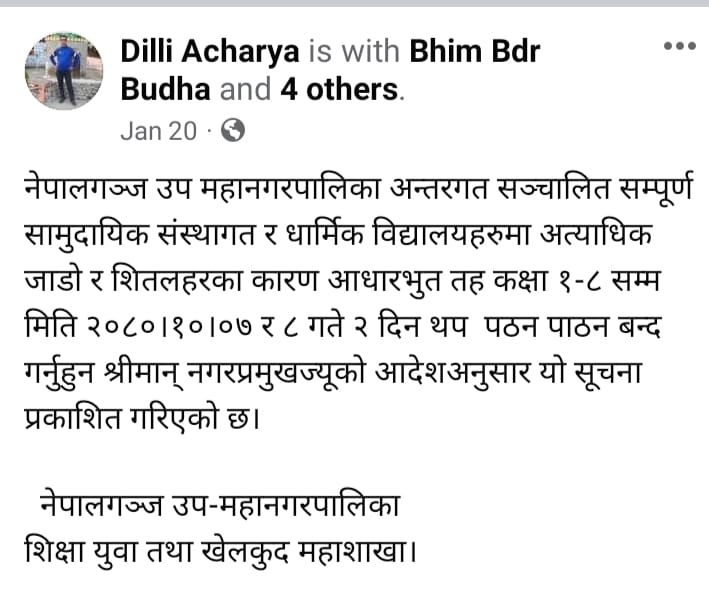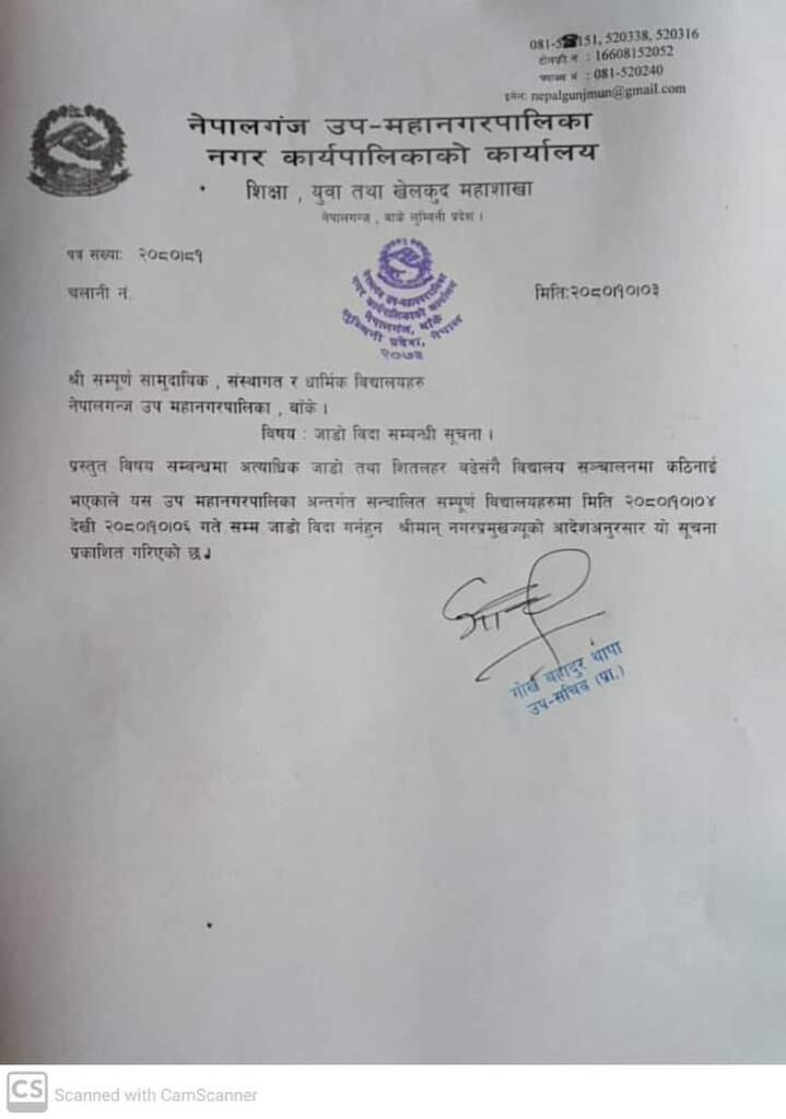 आज आइतबार पुनः अर्को सूचना प्रकाशित गरेर विद्यार्थीहरुमा चिसोले स्वास्थ्यमा असर पर्नसक्ने भन्दै नगर प्रमुखको आदेश अनुसार शितलहर बढेको भन्दै माघ १५ र १६ गते दुई दिन सम्पूर्ण विद्यालय बन्द गर्न नगर शिक्षा प्रमुखको हस्ताक्षर बाट सूचना निकालिएको छ ।