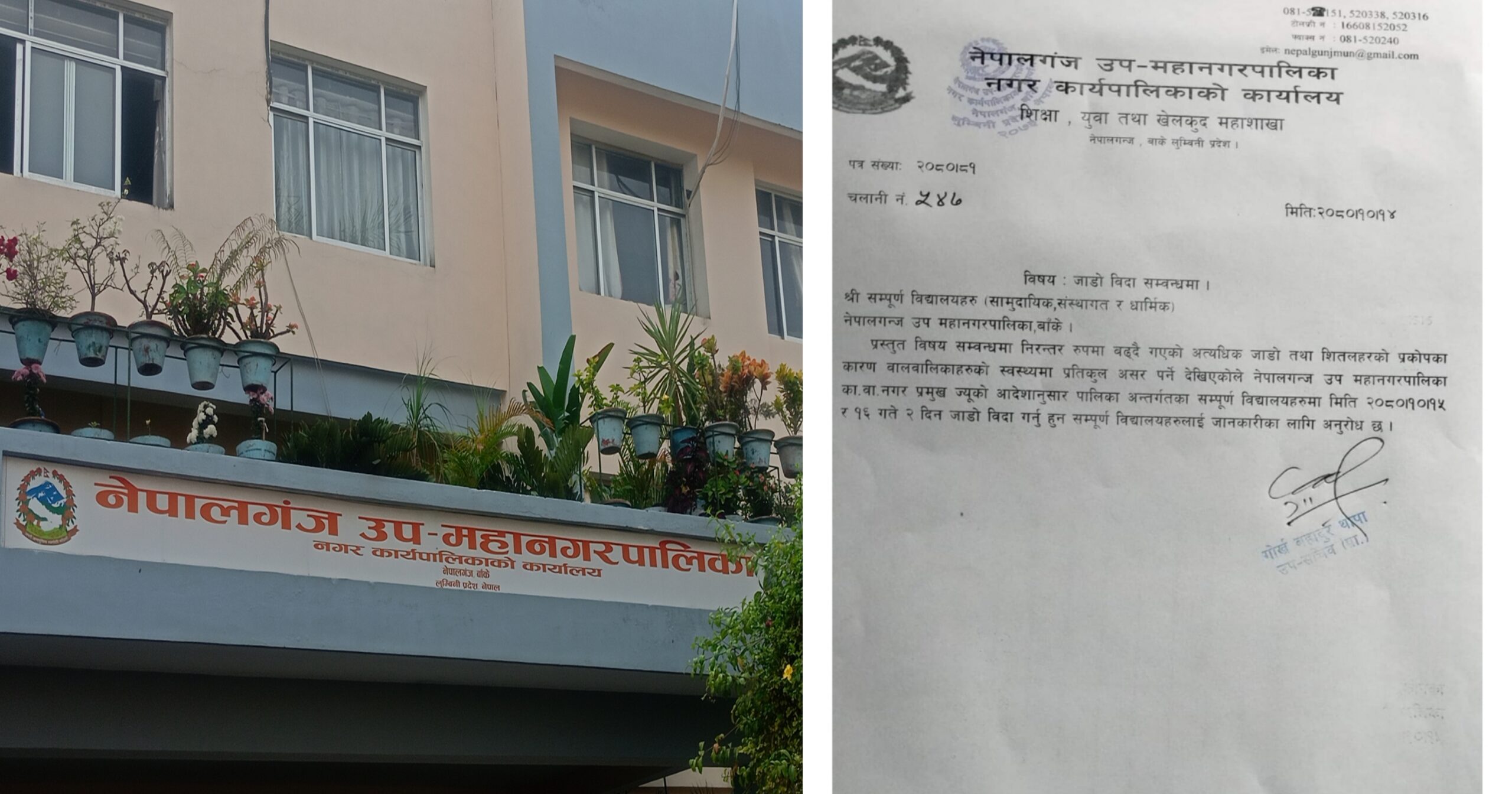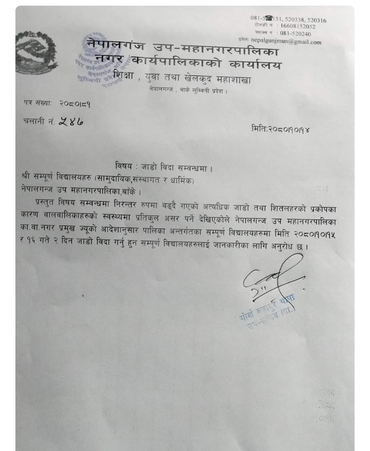 नेपालगन्ज : बाँकेको नेपालगन्ज उपमहानगरपालिकाले माघ महिनामा अत्यधिक जाडो बढेको भन्दै तीन तीन पटक सूचना निकाली जाडो विदा दिएको छ ।