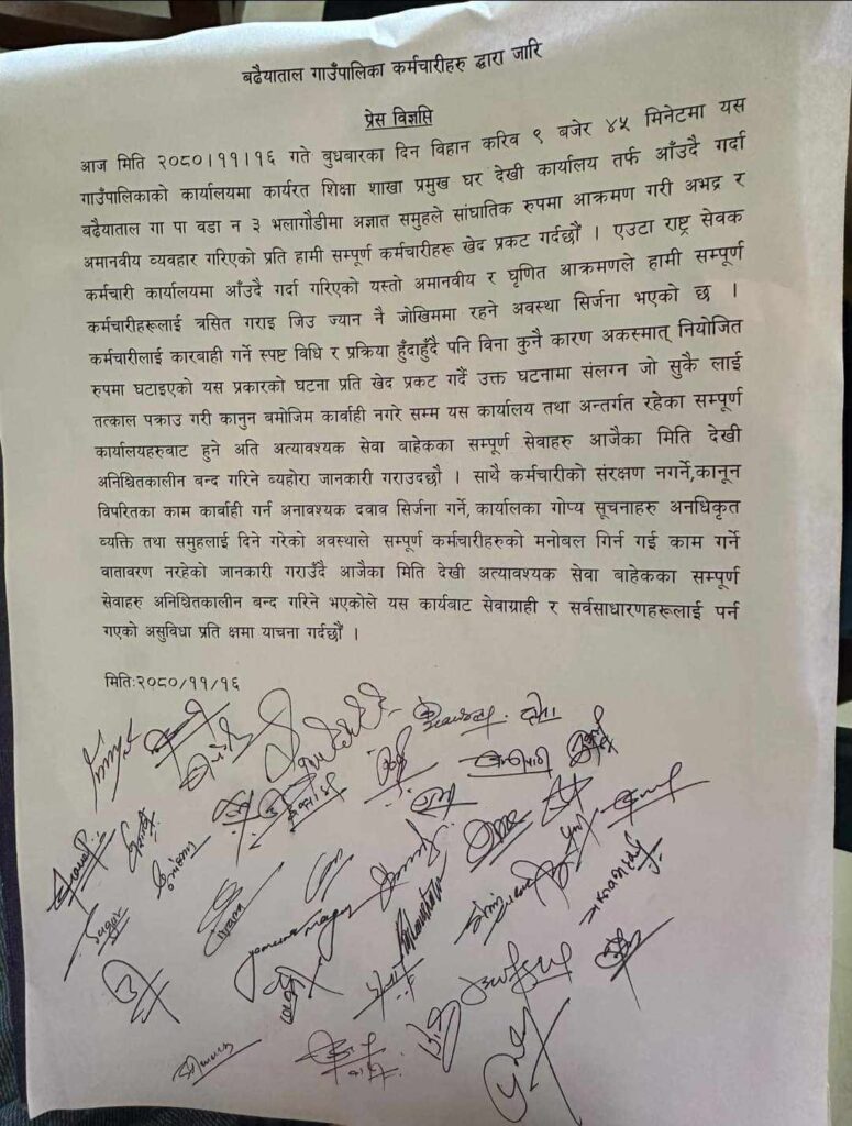 बुधबार प्रेस विज्ञप्ति निकाल्दै गाउँपालिका बाट घर फर्कने क्रममा सोही पालिकाका शिक्षा प्रमुखलाई अपरिचित व्यक्तिद्वारा आक्रमण गरिएको प्रति गम्भीर ध्यानाकर्षण भएको भन्दै विज्ञप्ति निकालिएको छ ।