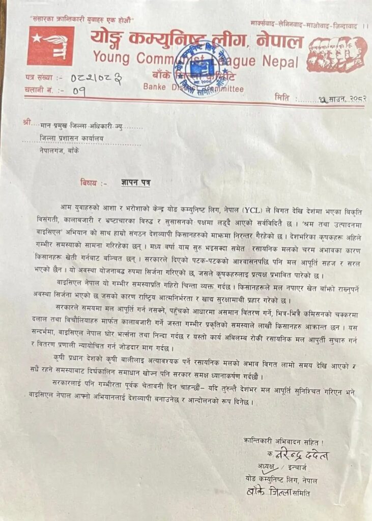 नेपालगञ्ज: वर्षा याम सुरु भएपनि रासायनिक मलको चरम अभावका कारण किसानहरु संकटमा परिरहेका बेला योङ कम्युनिष्ट लिग, नेपाल (वाईसीएल) बाँकेले प्रमुख जिल्ला अधिकारी सिडियोलाई ज्ञापनपत्र बुझाएको छ।