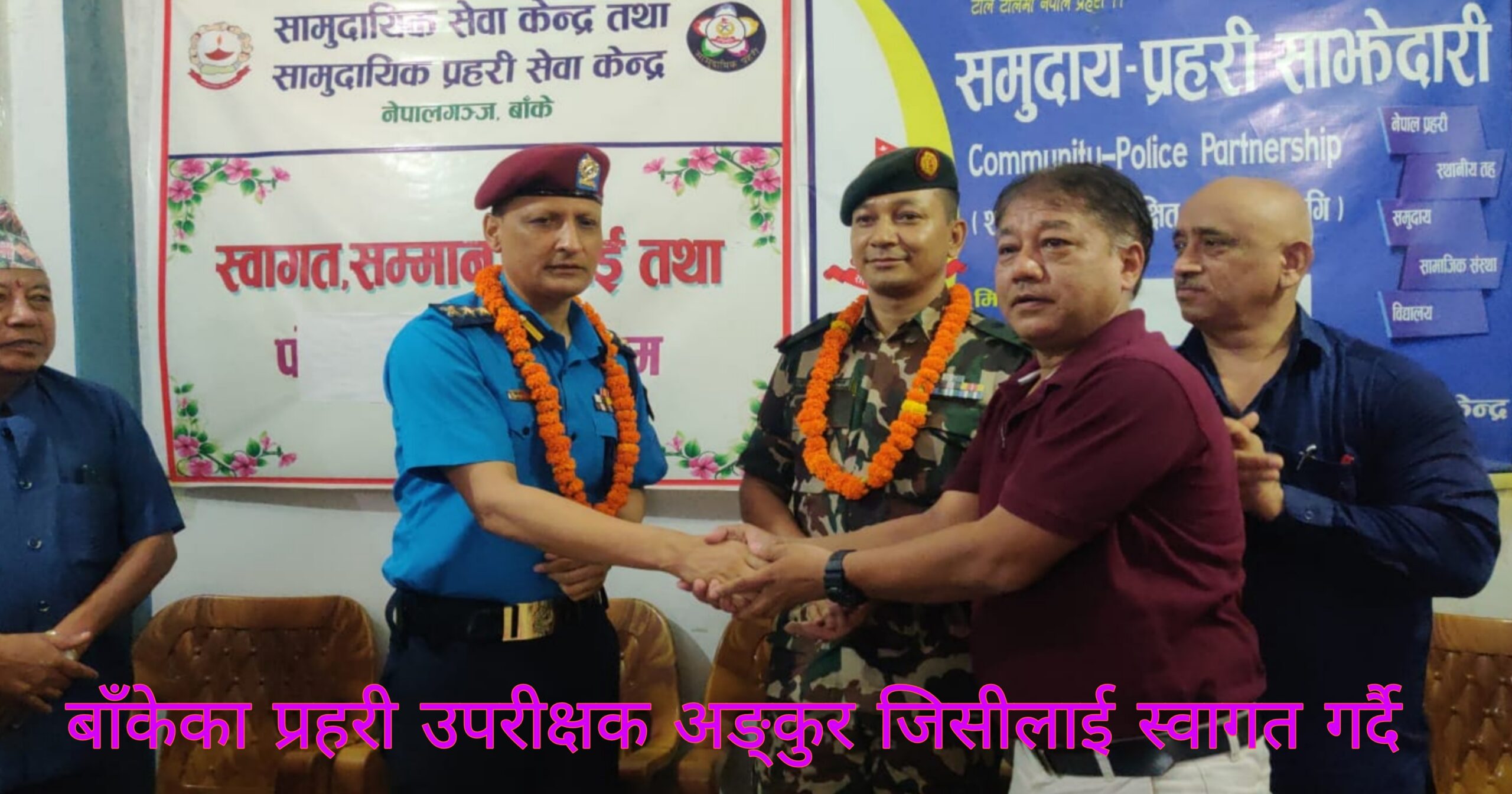 नेपालगन्ज- सामुदायिक सेवा केन्द्र तथा सामुदायिक प्रहरी सेवा केन्द्रको आयोजनामा शुक्रबार नेपालगन्जमा स्वागत तथा शुभकामना कार्यक्रम सम्पन्न गरिएको छ । भर्खरै आउनु भएको जिल्ला प्रहरी कार्यालय बाँकेका प्रहरी उपरीक्षक अङ्गुर जि.सी. र वज्रदल गुल्मका गणपति प्र.से. रामचन्द्र श्रेष्ठलाई स्वागत तथा परिचयात्मक कार्यक्रम सम्पन्न भएको हो ।