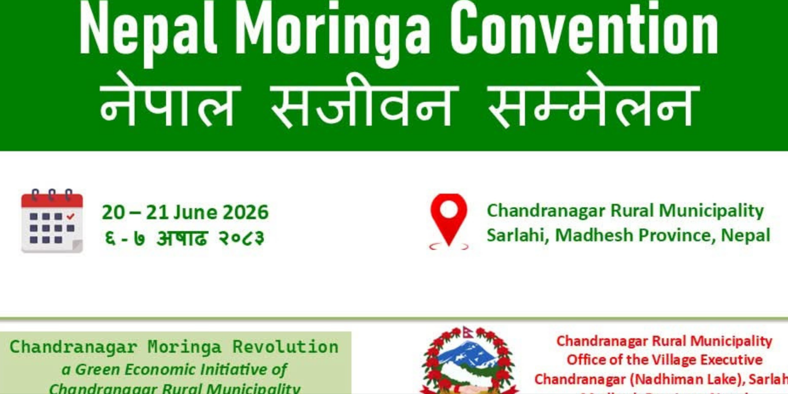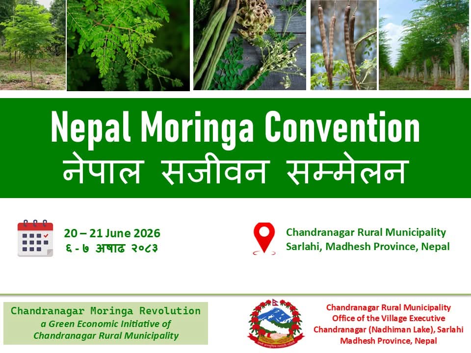 नेपालगन्ज : सर्लाहीको चन्द्रनगर नेपालमा पहिलोपटक “सितलचिनी सम्मेलन तथा मोरिंगा खाद्य महोत्सव २०२६” आयोजना हुने भएको छ। असार ६ र ७, २०८३ मा नाधिमान ताल परिसरमा हुने यस कार्यक्रम चन्द्रनगर गाउँपालिकाको आयोजनामा सञ्चालन हुन लागेको हो। कार्यक्रमको अगुवाइ गाउँपालिका प्रमुख राज कुमार महत्त्व ले गर्नुभएको छ।
