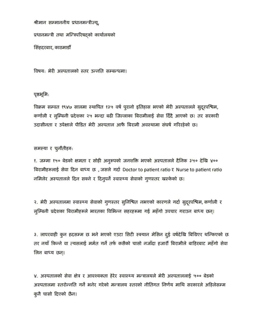 भेरी अस्पताललाई ५०० बेडको Super Speciality Hospital मा स्तरोन्नति गर्ने सम्बन्धमा।