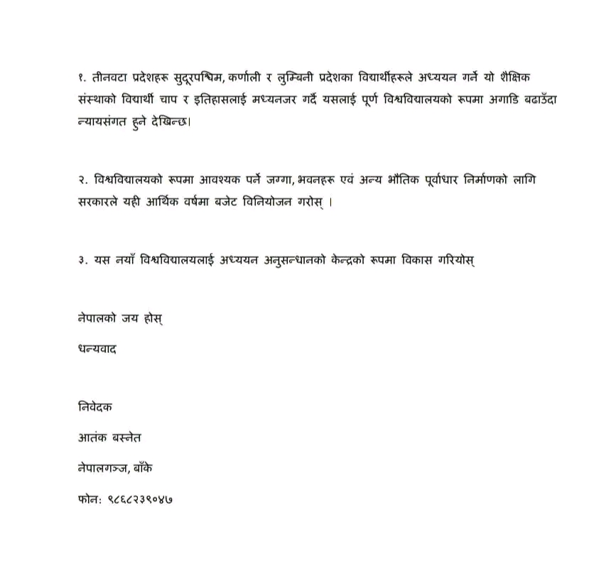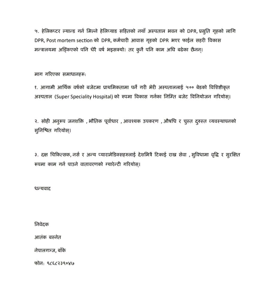 नेपालगन्ज : जनताका कुराहरू राख्न माननीय नै हुनुपर्छ भन्ने कुरालाई ठूलै चुनौती दिदै बाँकेका समाजसेवी युवा आतंक बस्नेतले प्रधानमन्त्री तथा मन्त्रिपरिषदको कार्यालयमा प्रधानमन्त्रीलाई सम्बोधन गर्दै बाँके जिल्लाको स्वास्थ्य, शिक्षा र रोजगारका तीन प्रमुख क्षेत्रहरूको विकास र प्रवर्द्धनका निम्ति निवेदन पेश गरेका छन् ।